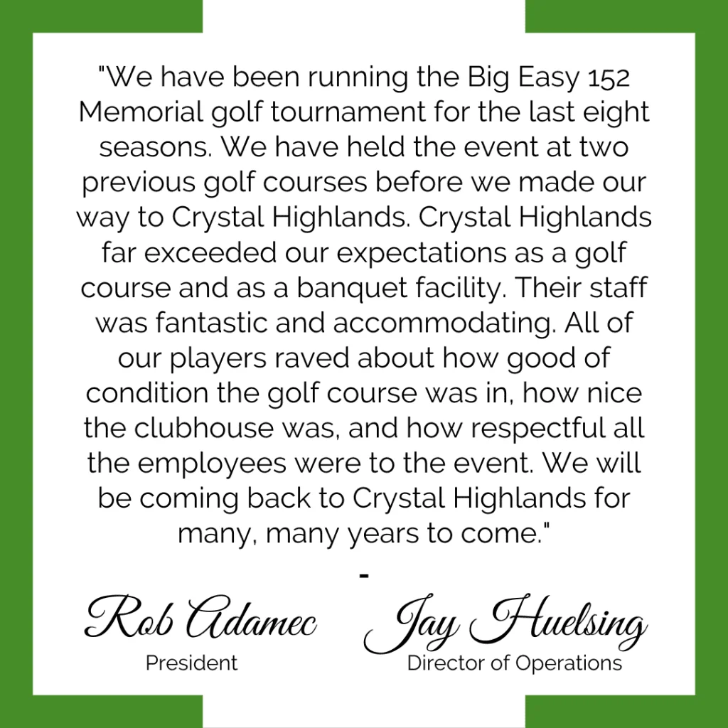 Our team helps ensure your event is successful by providing guidance through every part of the planning, marketing and execution phases to make sure you and your players have an amazing experience at Crystal Highlands. Explore our options below and reach out to us to begin planning your next outing.